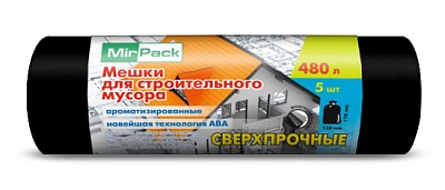 Мешки для строительного мусора 480 литров, 70 мкм, в рулоне 5 штук, ПВД, черные, 2 слоя, 130x170 см, Стройка, особопрочные