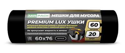 Мешки для мусора с ушками 60 л, 20 шт, 20 мкм, черные, 60*76 см, серии «Premium Lux Ушки»