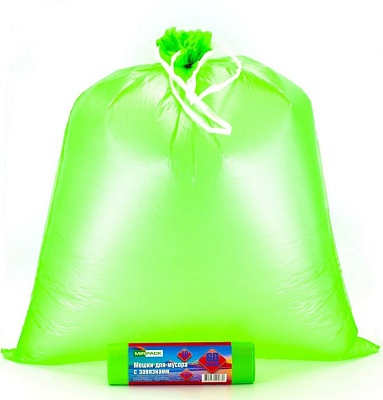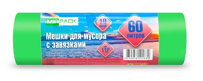 Пакеты мусорные с завязками 60 л, 15 мкм, 10 штук, ПНД, зеленые серия VIP