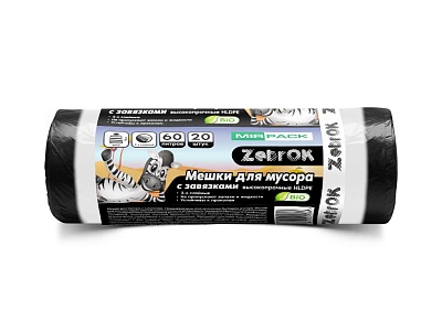 Мешки для мусора с завязками 60 л, 20 шт. ПВД 40 мкм, серия ZebrOK, черно-белые, полосатые